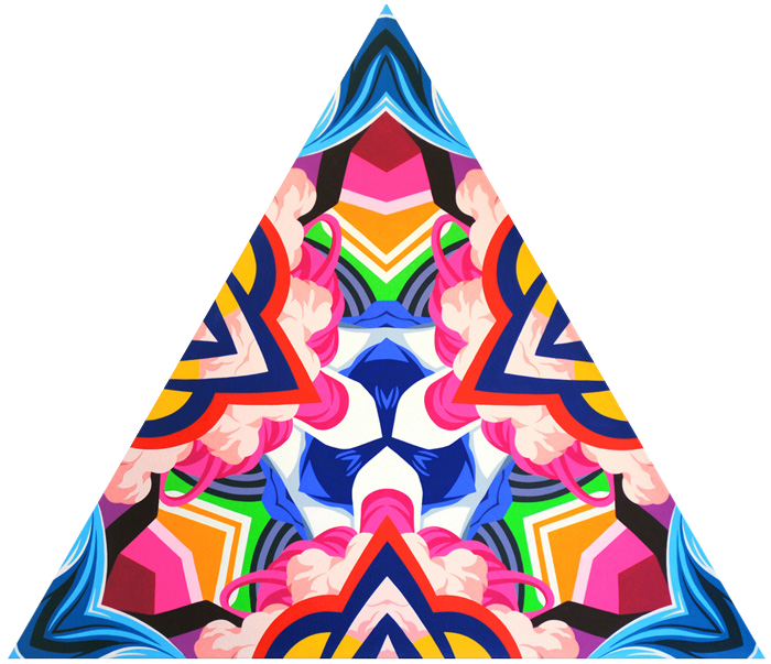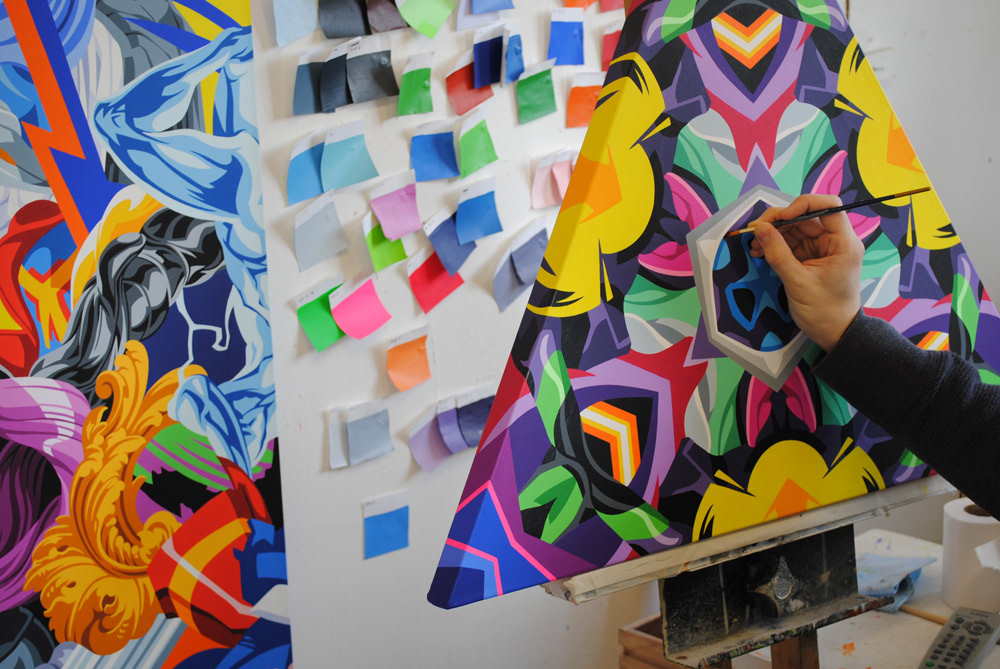 My Kiazmus and Tesslar series have multiple reference points including New Age psychedelia, Tribal art, stained glass windows, the excesses of the Baroque and Haute Couture fashion, Japanese animation, video games and comic books.
