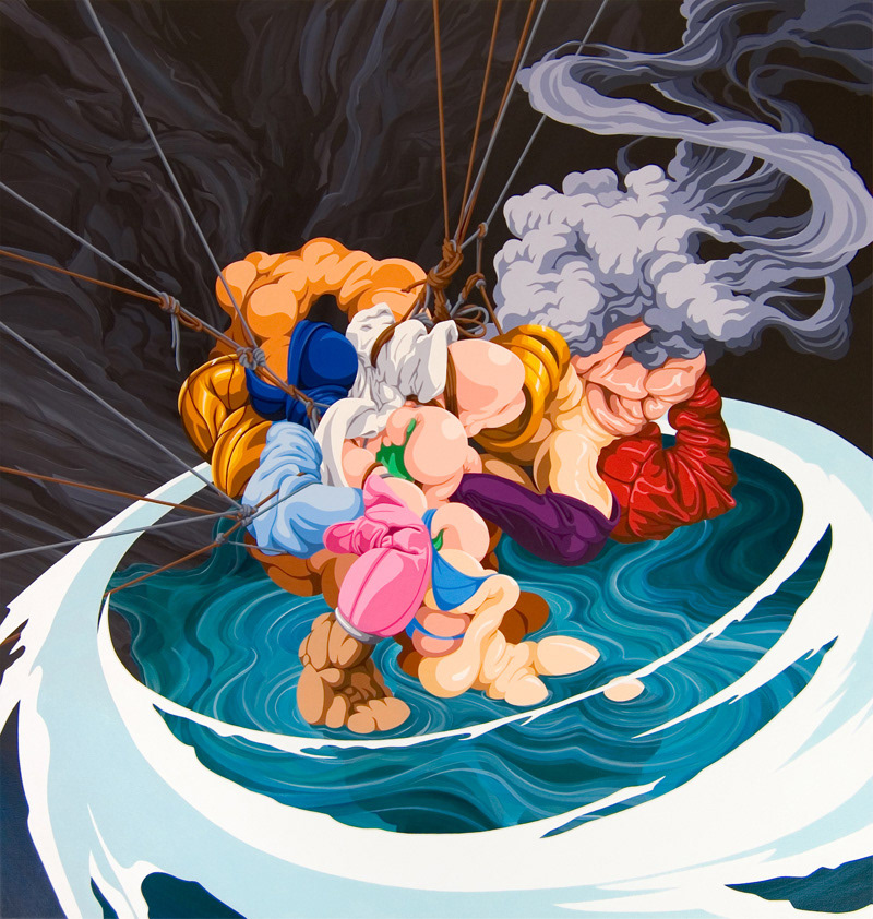 This peakshift is present within advertising, Hollywood blockbusters, computer games, Baroque art and Haute couture fashion as well as in the extreme forms of body exaggeration found in bodybuilding and pornography. Japanese animation which also uses this technique has also informed my painting style. By isolating out what I see as the crucial parts of such images and collaging them together into the work my intention is to intensify these visual triggers even further so they form a sort of neurological hyperactivity.