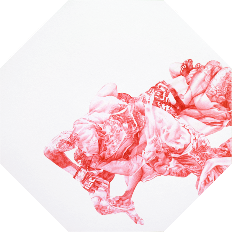 Having previously pursued filmmaking as a side project, through script writing and the making of short films - including the Vimeo Awards 2010 shortlisted film 'Outside' - I have now chosen to intergrate those ideas into my main body of work. In 2005 I wrote a screenplay called 'Nirodha Point', a self-reflexive look at Hollywood, fame and material excess. With the intention of expanding the world created within 'Nirodha Point' I immediately started writing a prequel, but it's sprawling narrative failed to fully coalesce. As a result I have chosen to produce a series of drawings that will explore those ideas in their current nebulous state entitled 'The Inscending Spiral'. My past work sought to explore the dichotomy between the visual language of materialism and spirituality. Similarly within the narrative of 'The Inscending Spiral' I have set out to describe a world where the linear sliding scale between the superficial glossy world of materialism and the profound depths of spiritual understanding were in fact a closed loop. That the seeming chasm between these polar opposites, from the emptiness of the airhead Valley girl to the empty mind of the enlightened Zen monk, could be traversed with a mere step. Using the labyrinthine back streets and highway intersections of Los Angeles as a back drop, the multiple narrative threads follow the strangely skewed spiritual journeys of a Beverly Hills rich kid, a pornstar, a MMA fighter, an artist, a gang member, a celebrity publicist and a homeless bag lady. Underscored by the tremors of a looming earthquake and the machinations of a mysterious LA gang called 'The Labrys', the story turns around one central incident, a car crash, the first and only encounter between the two main protagonists, Aidan Kincaid and Rosa De la Cruz.